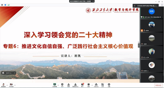 院长助理班凯谈到,通过共九个专题的学习,对党的二十大报告有了更进一步的领悟和认识,这对于个人改进提升工作,加强自身建设等都有极强的指导意义。在今后的工作中,将继续认真学习贯彻党的二十大精神,以人为镜,以史为鉴,同时还要做到知敬畏、存戒惧、守底线,强化纪律作风,不断为学校、学院“双一流”建设贡献力量。