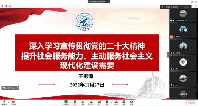党委副书记张莹谈到,党的二十大报告中指出,教育、科技、人才是全面建设社会主义现代化国家的基础性、战略性支撑。作为新时代教育科研工作者,要以习近平新时代中国特色社会主义思想为引领,把握以学生需求为中心的基本内涵,明确时代需求,进一步增强为党育人、为国育才的政治觉悟与担当,切身引导青年学生积极投身于科教兴国、人才强国的伟大实践,为建设世界重要人才中心和创新高地提供有力支撑。