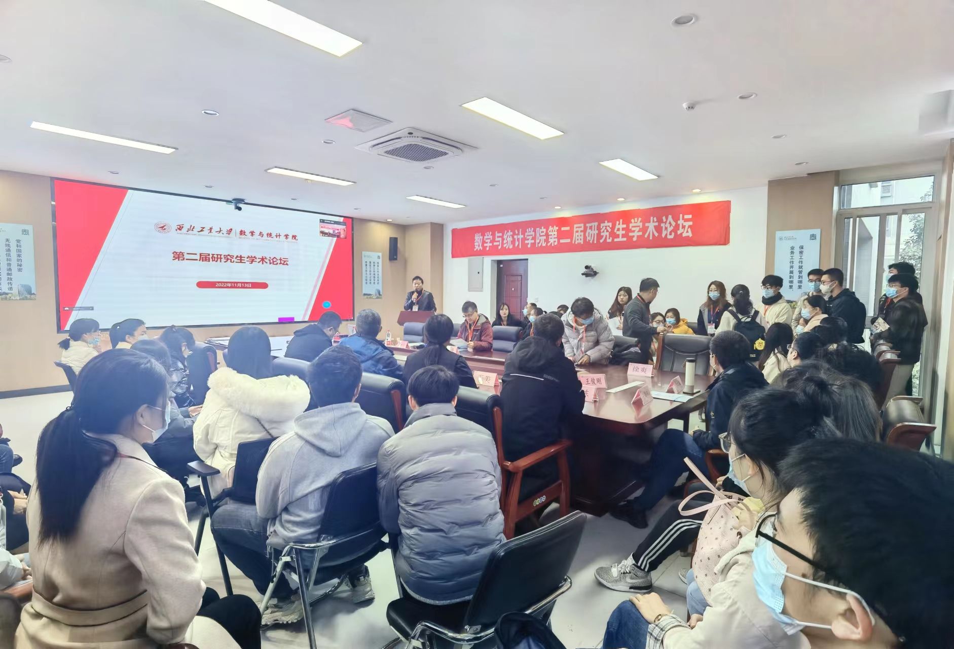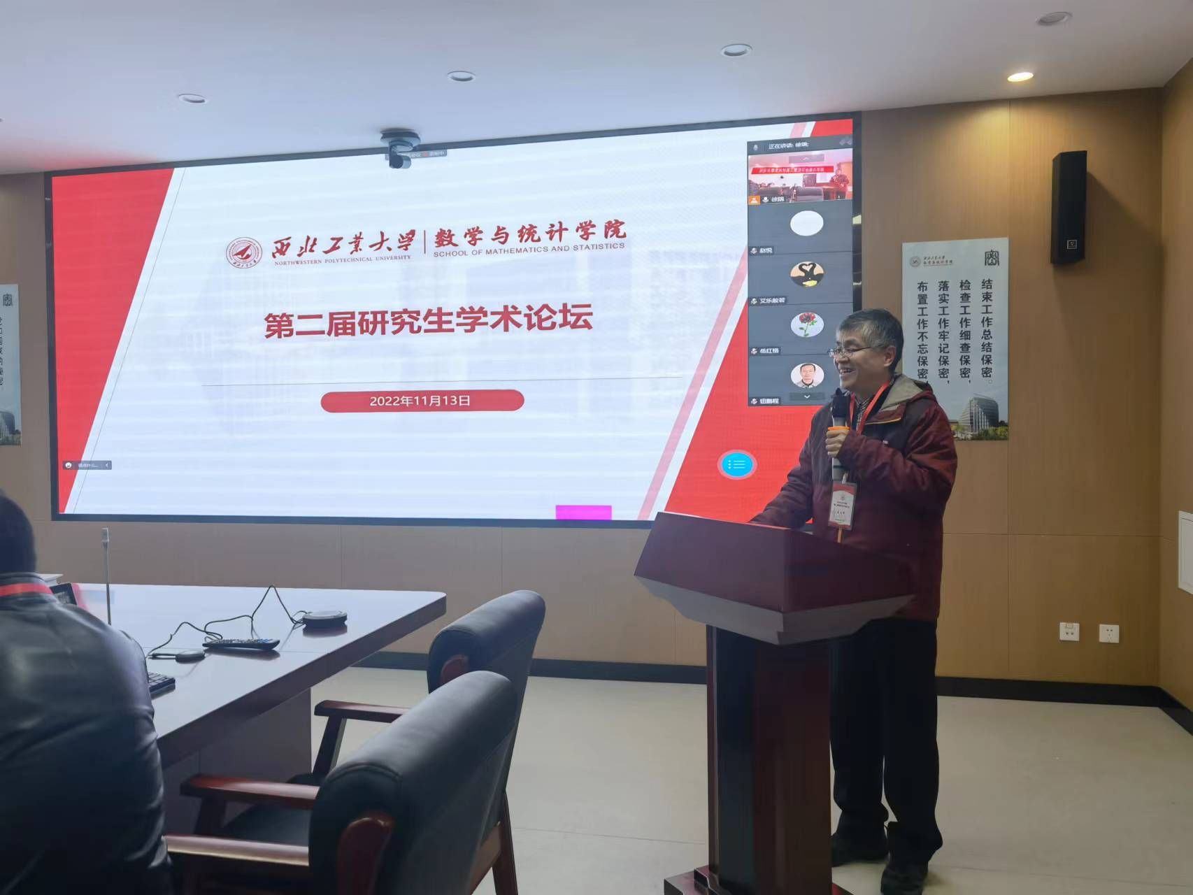 为进一步落实数学学科“双一流”建设,深入贯彻落实学校《一流研究生人才培养行动计划》,营造研究生学术创新氛围,2022年11月13日,金沙娱乐场 在西北工业大学长安校区召开第二届研究生学术论坛。根据疫情防控相关要求,本次论坛采取分设理学楼A201、A214、A315三个会场,线上线下结合的方式举行。党委书记王莉、院长聂玉峰、副院长徐根玖、副院长都琳以及二级学科负责人、青年教师代表、各年级研究生、其他高校师生等共230余人分别通过线上线下的形式参加了本次论坛,论坛由副院长徐根玖主持。
