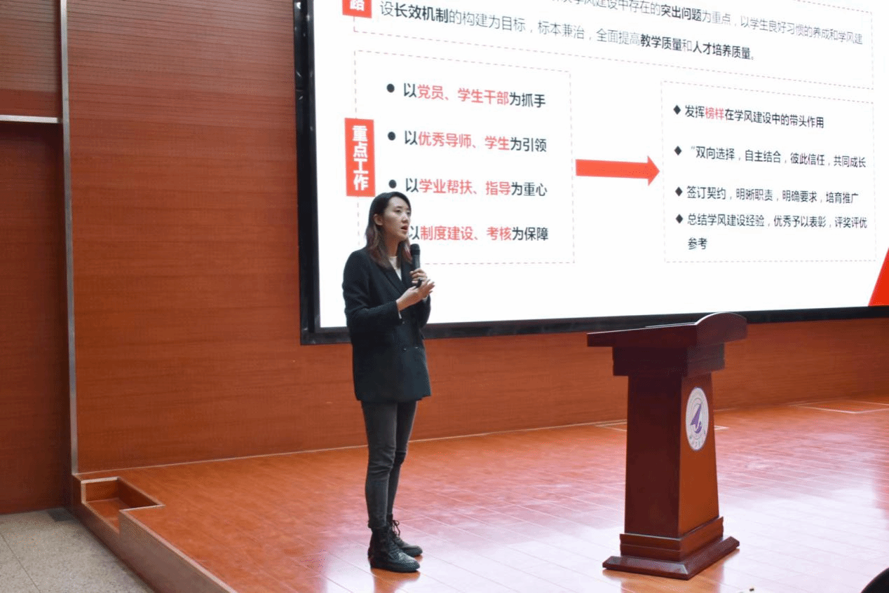 随后,学院副院长郭千桥结合目前各年级成绩数据、学业警示数据,全面分析了学院本科生学业现状;学院党委副书记张莹围绕学风建设内涵、升学就业情况、学院学风现状等方面进行金沙娱乐场 本科生学风分析,并启动金沙娱乐场 学风建设小树苗1+1学习伙伴计划。