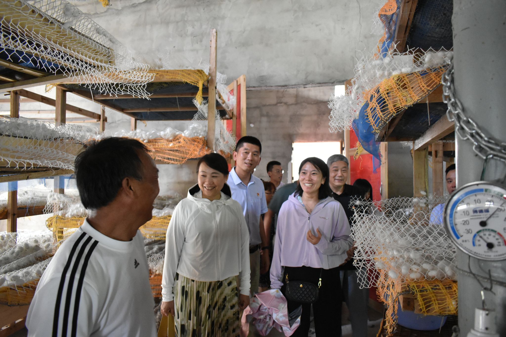在我校驻宝山村第一书记兼工作队队长王峰、驻村干部庆晓勇的精心组织安排下,两院师生首先参观了巩固脱贫攻坚成果有效衔接乡村振兴的帮扶项目—新润农牧有限公司高山茶园茶厂,万达农业开发有限责任公司生态桑园蚕场,负责同志详细介绍了在学校与当地政府的支持下,他们如何应用现代化科学技术推广生产模式,延长产业链条,提高经济收入。鲜活的事例和现场的学习,使大家都对以特色产业振兴,进而推动乡村全面振兴有了更清晰直观的认识。