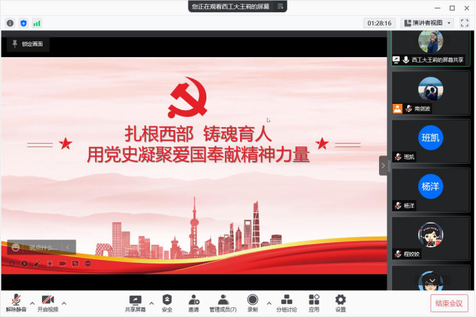 根据前期学习安排,在支部成员充分自学的基础上,南剑波、李淑雯、王霜玥三位同志分别领学了《深入实施新时代人才强国战略,加快建设世界重要人才中心和创新高地》,班凯、程姣姣两位同志领学了《以史为鉴、开创未来、埋头苦干、勇毅前行》。五位同志还就个人的学习体会,近期在学校防控疫情工作中开展的相关工作等进行了分享。