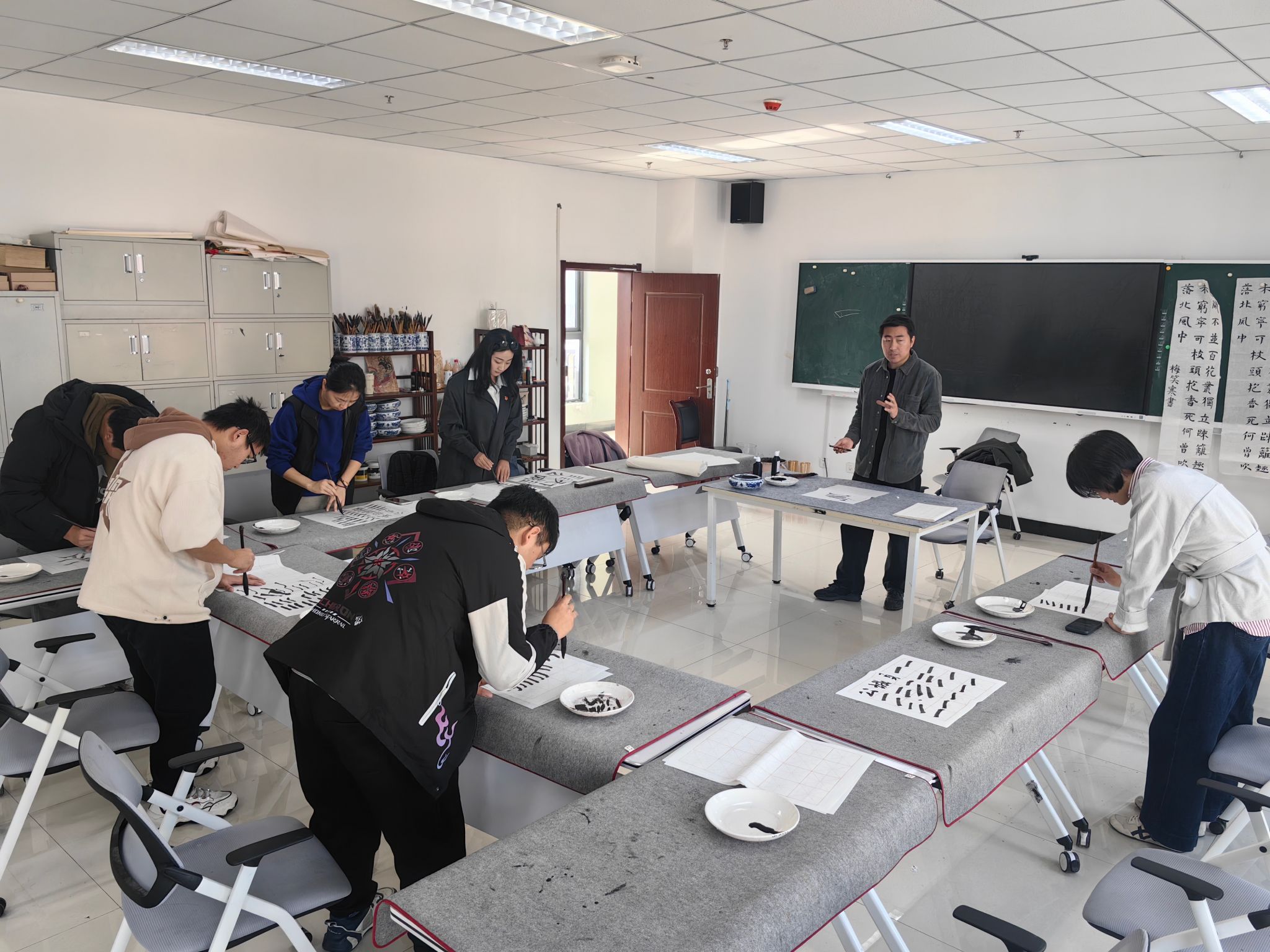 艺术教育中心特邀专业教师赵运全程指导。活动伊始,教师从汉字演变脉络讲起,细致拆解核心笔法,结合校训校风等关键词书写示范。现场案台宣纸铺展、笔墨齐备,党员们围坐观摩,在教师手把手指导下纠正握笔姿势,反复练习笔法技巧,墨香与交流声交织,氛围专注而热烈。