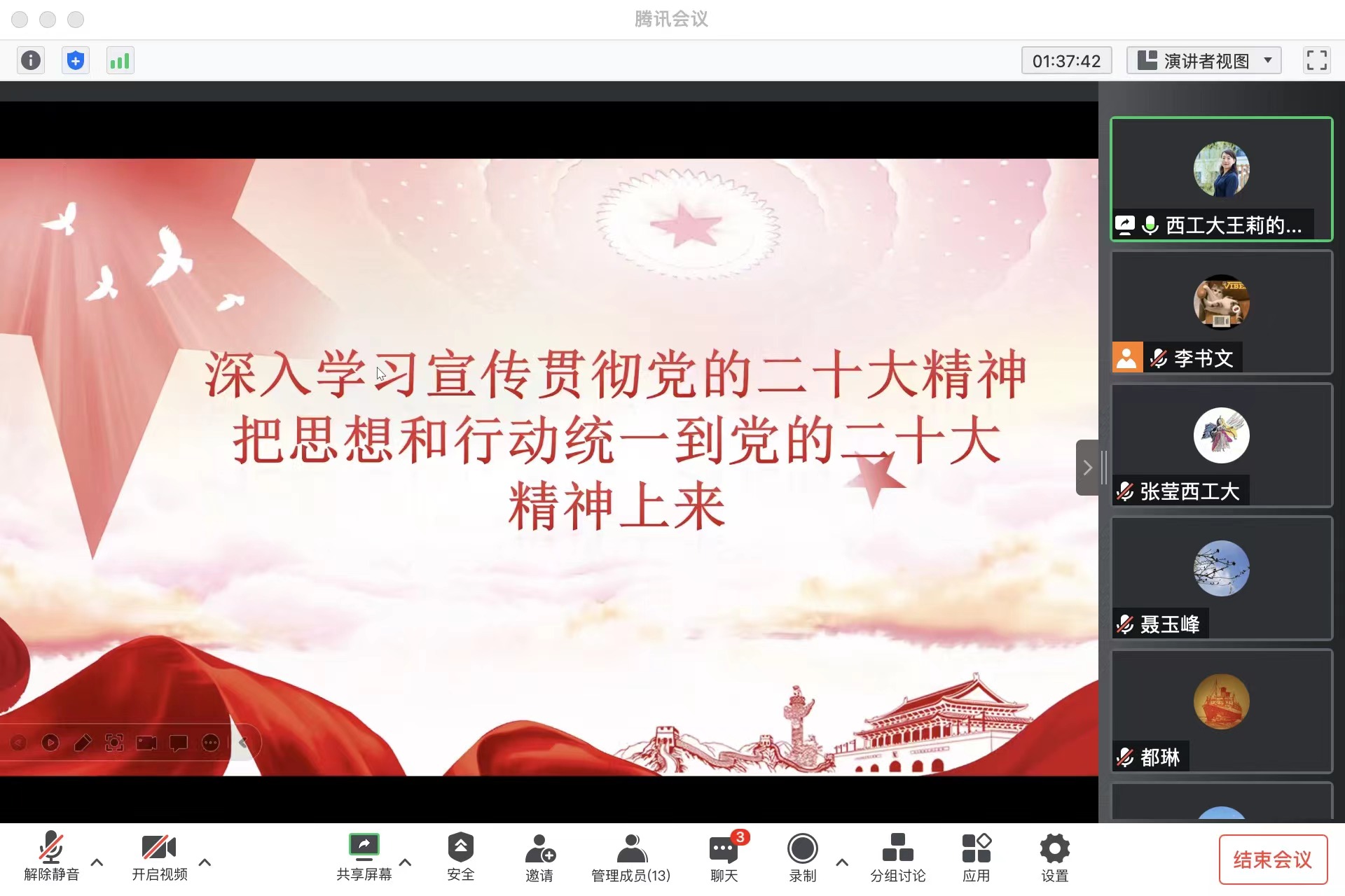 王莉带领与会成员学习了党的二十大报告、《中共中央举行新闻发布会解读党的二十大报告》《习近平在二十届中共中央政治局常委同中外记者见面时强调始终坚持一切为了人民一切依靠人民以中国式现代化全面推进中华民族伟大复兴》《习近平总书记参加广西代表团讨论时的重要讲话精神》《习近平主持中共中央政治局第一次集体学习并发表重要讲话》五项内容,随后传达了学校学习贯彻党的二十大精神会议相关内容及要求。