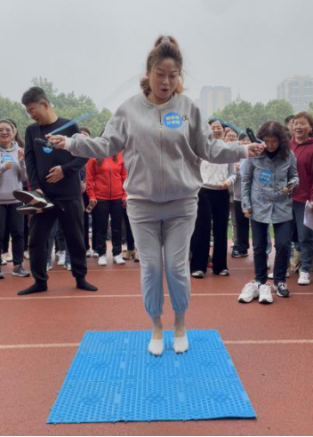 第三个项目是“指压板跳绳”。在现场观众的呐喊助威下,每位老师都鼓足了劲全力以赴,指压板上接力跳,忍着脚下的痛也要进行下去,将趣味进行到底!