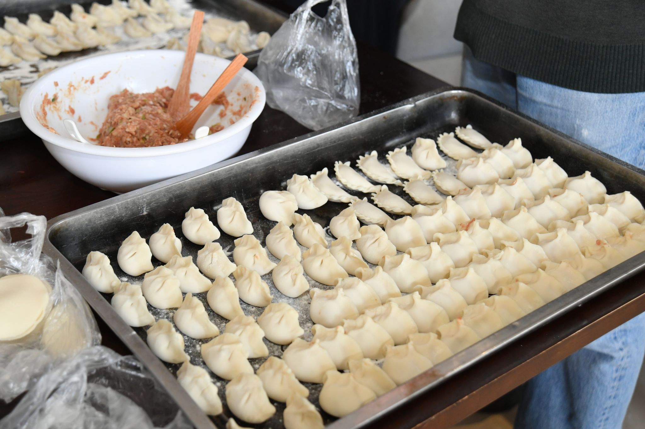 当天中午活动现场,暖意融融,热闹非凡。学院教师们纷纷撸起袖子,分工协作,忙得不亦乐乎。平日里在讲台上“传道授业”的“老先生”,此刻都化身成了厨艺精湛、手法娴熟的“老师傅”,捏出的一个个圆润饱满的饺子,褶皱均匀,美观诱人。大家一边包着饺子,一边分享着生活趣事、教学心得,彼此间真挚的情谊也在共同劳动中悄然传递。