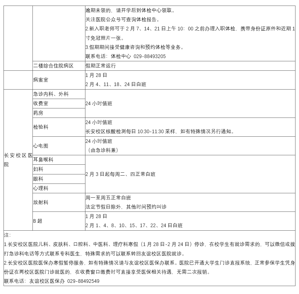 4.长安校区收发室值班时间:每周四9:30—16:00(除夕至初六休息),服务电话:88430002(注:收发业务值班安排需在邮政运输恢复正常后执行)。