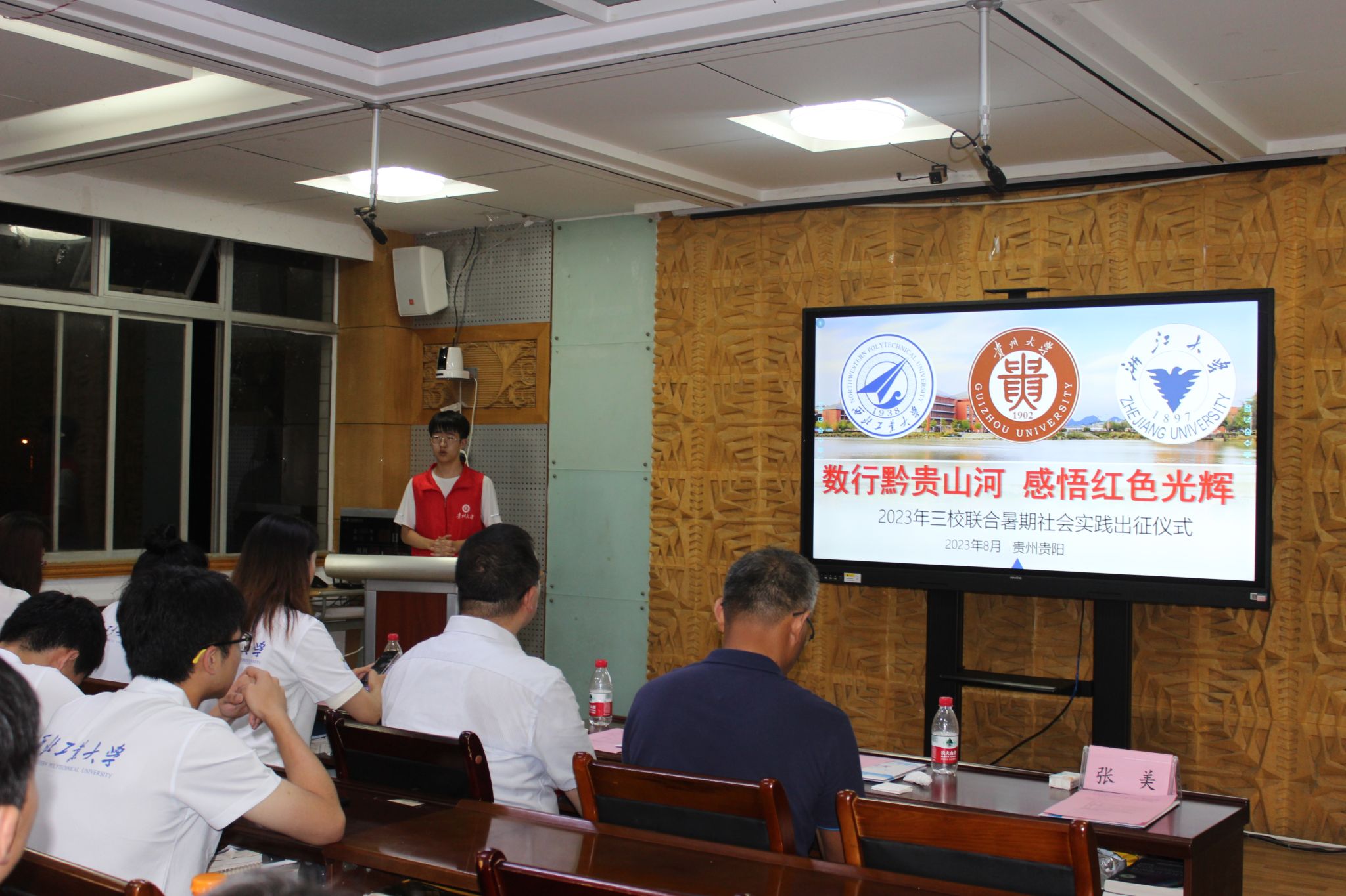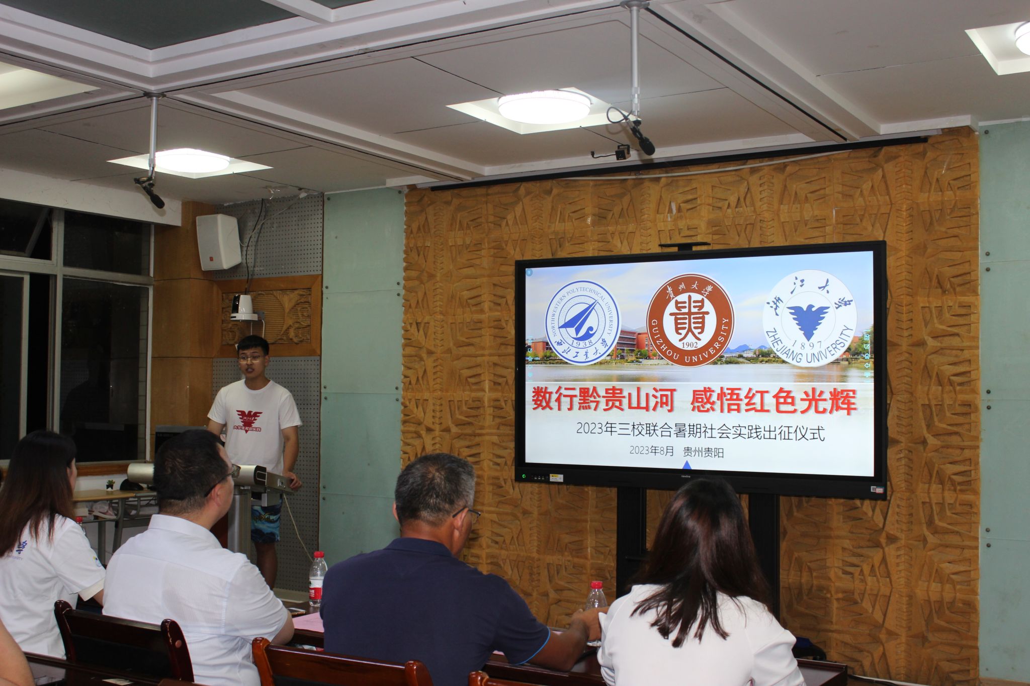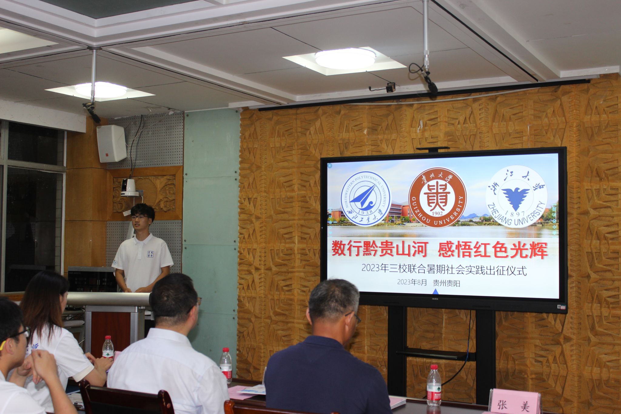 2023年8月5日,西北工业大学、贵州大学及浙江大学三校联合社会实践出征仪式在贵州大学东校区博学楼329会议室举行。贵州大学金沙娱乐场 院长王锦荣教授、贵州大学学术委员会办公室主任贾平生教授、金沙娱乐场-金沙娱乐场app 党委副书记张莹教授、西北工业大学学校办公室戴卓老师、贵州大学金沙娱乐场 辅导员张美老师出席,三校实践队全体成员22人参加。会议由贵州大学金沙娱乐场 团委书记高洪老师主持。