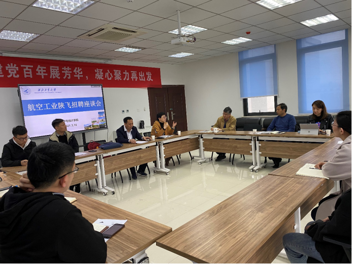 2021年3月16日下午,航空工业陕西飞机工业有限责任公司赴金沙娱乐场 开展招聘座谈会,陕飞公司人力资源部/党委组织部部长张海琪,人力资源部人事处处长杨怀斌,人力资源部人事招聘主管郑椿怀,设计研究院主管设计李昌凡;金沙娱乐场 院长聂玉峰,党委副书记张莹,张胜贵教授,辅导员王刚,兼职辅导员王悦欣、刘鹏及2021届毕业生代表等相关人员参加了此次座谈。