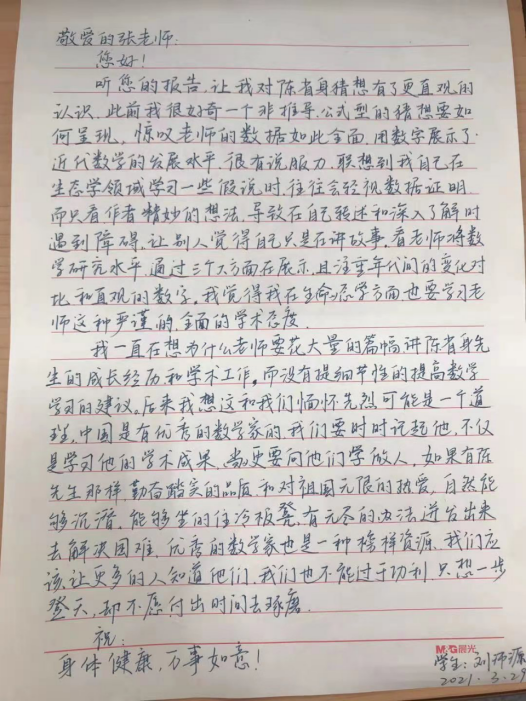还有网友写道:“张老师,我周围听讲的同学都觉得收获非常大,尤其是您对中国数学的现状以及落后原因的分析,让同学们极大地开阔了视野,跳出对书本的学习,真正去关心我国数学发展的现状”。