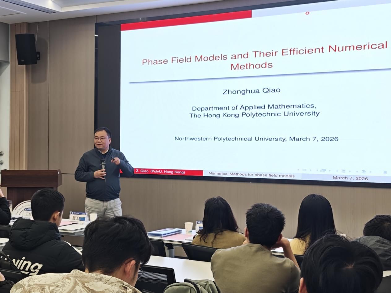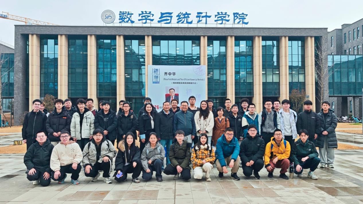 乔中华教授以《Phase Field Models and Their Efficient Numerical Methods》(相场模型及其高效数值方法)为主题作学术报告。他系统介绍了相场模型的数学原理、前沿应用场景以及高效数值算法设计的最新研究进展,并结合自身研究经历展现了数学理论在材料科学、流体力学等前沿交叉领域的广泛应用,同时勉励在场学子筑牢专业根基,保持探索未知的学术勇气,主动投身基础科学研究。
