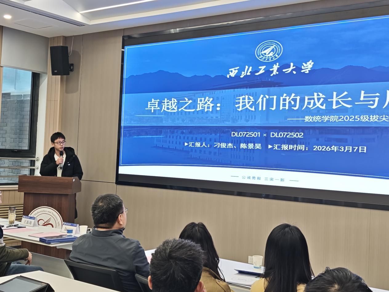 2025级拔尖班学生代表刁俊杰作班级成长汇报。他从学业成绩、学风建设、科研竞赛、班级文化、未来展望等维度汇报班级建设成果,并围绕学校“一十百千”发展目标,明确了班级后续发展规划,提出将以打造拔尖人才培养模范班级为目标,以实际行动彰显新时代数统学子的使命与担当。
