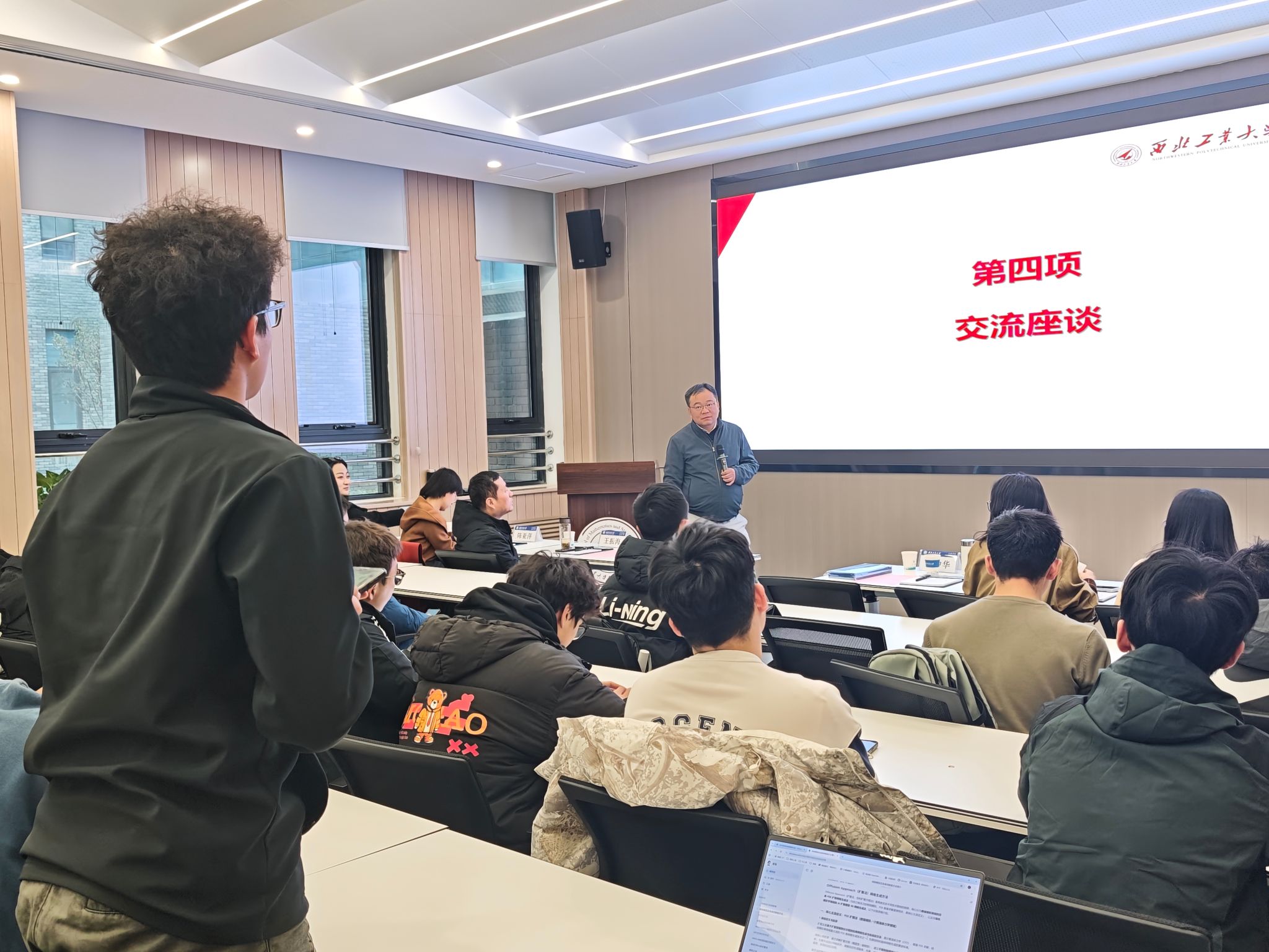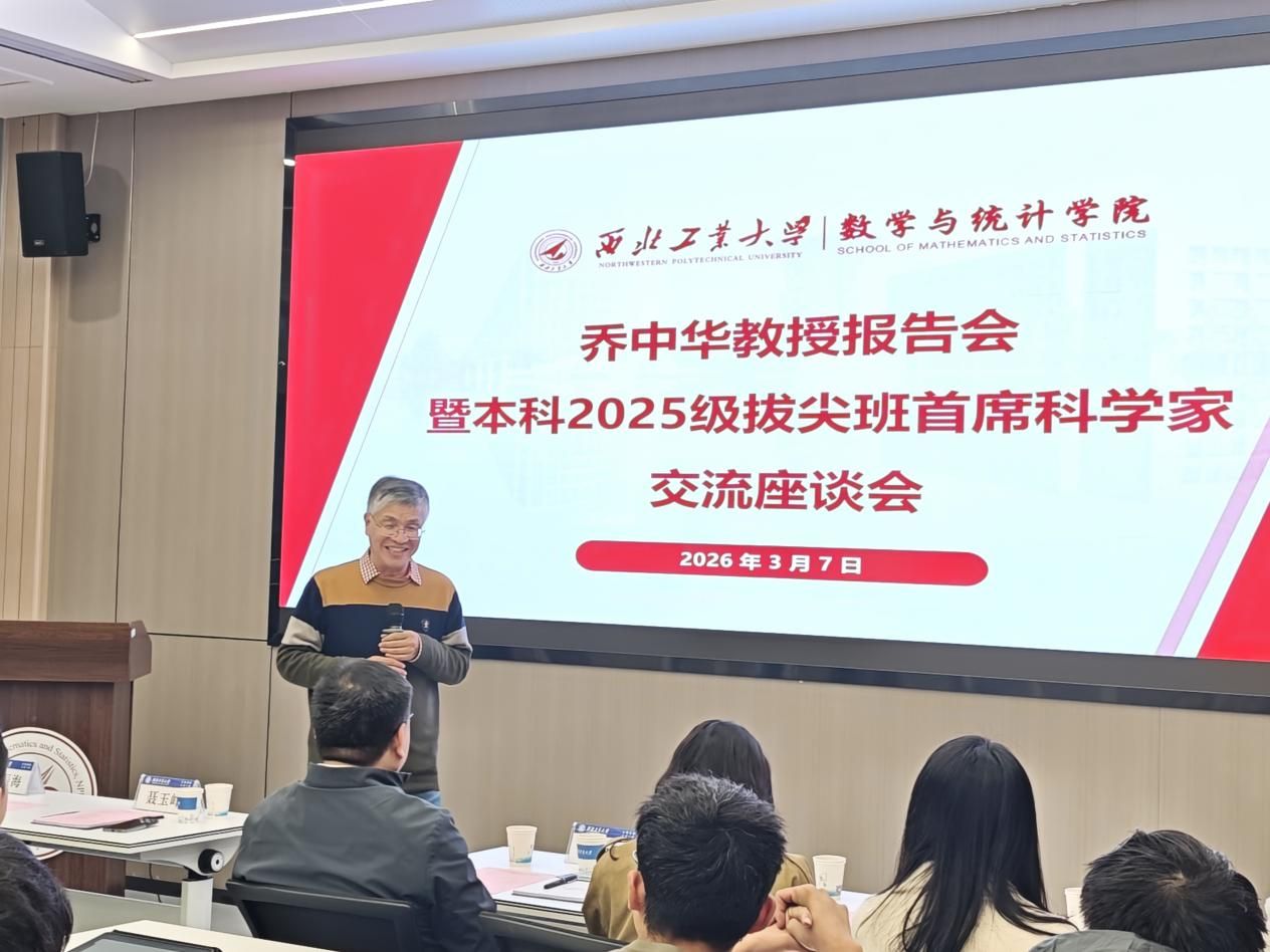 为深化高水平学术交流,推进基础学科拔尖创新人才培养,3月7日下午,金沙娱乐场 于海天苑大楼E108成功举办“翱翔灵犀学术殿堂”第931期——乔中华教授学术报告会暨本科2025级拔尖班首席科学家交流座谈会。香港理工大学应用数学系讲座教授、2025级拔尖班首席科学家乔中华受邀主讲,学院院长聂玉峰、党委副书记张莹、拔尖班班主任王振海、青年教师代表、2025级本科生辅导员张倩及2025级拔尖班、铸剑7班全体学生参与活动,会议由张倩主持。