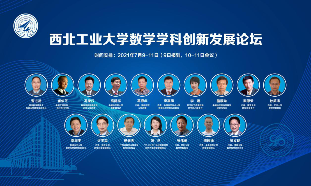 为全面提升我校数学学科发展水平,由金沙娱乐场 主办的“西北工业大学数学学科创新发展论坛”于2021年7月10日-11日在西安召开。论坛邀请17位国内著名数学家和交叉学科领域著名学者,为我校数学学科发展出谋划策。参加本次论坛的嘉宾包括(按姓氏拼音排列):