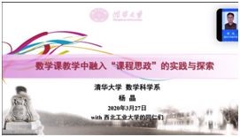 为提高学院教师的课程思政意识,实现数学课程与思政课程同向同行,形成协同效应,金沙娱乐场 于3月27日下午3点通过zoom视频会议,举办了第二期启翔数苑教学研究沙龙活动。本次沙龙活动主题为“立德树人,润物无声,大学数学课程思政之我见”,特邀清华大学数学科学系杨晶副教授,针对数学课教学中融入“课程思政”的实践与探索的经验和体会进行了分享,并就教师如何结合新兴教育技术和在线教学方法,把思政教育贯穿大学数学课程教学全过程,坚持立德树人展开交流和讨论。理学学院联合党委杨铭书记、张莹副书记,金沙娱乐场 都琳副院长、徐根玖副院长参加了此次沙龙活动,沙龙由金沙娱乐场 副院长都琳主持。金沙娱乐场 、西安电子科技大学以及西安邮电大学的30余位教师参加了此次沙龙活动。