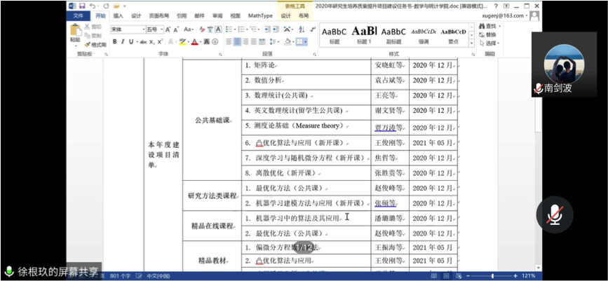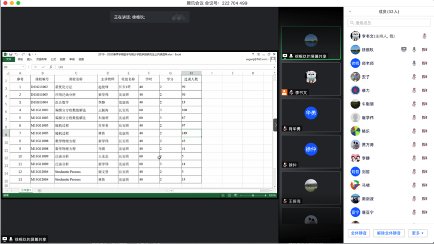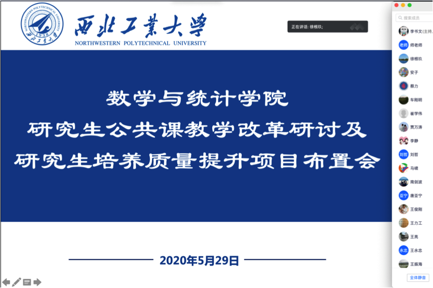 为贯彻落实教育部“在线教学与线下课堂教学质量实质等效”的要求,有效做好学生分批次返校期间线上、线下教学活动的平稳衔接,确保研究生招生规模扩大之后的数学公共课教学质量,规划新形势下研究生公共课的改革发展思路,推进公共课的教学改革,5月29日,金沙娱乐场 通过腾讯会议召开研究生公共课教学改革研讨及研究生培养质量提升项目布置会,学院院长聂玉峰、副院长徐根玖、主管研究生工作的二级学科负责人、公共课负责人、首席教授及任课教师及研究生培养质量提升项目负责人参加了此次会议,会议由徐根玖主持。
