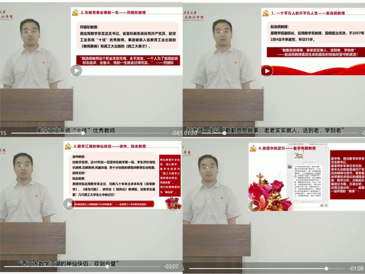 在会上王莉分享了郭千桥老师的“微党课”《讲西工大老一代数学人故事,悟共产党员精神》,通过“一个平凡人的不平凡的人生--赵选民教授”、“为教育事业奉献一生--符丽珍教授”、“数学江湖中的神仙侠侣--徐仲、陆全教授”、“地震中的逆袭——崔学伟副教授”等几位金沙娱乐场 教师的先进事迹,让青年教师亲身体会老教师对教育事业的无私付出,希望青年教师能够传承老一代数学人“勤勤恳恳做事,老老实实做人,活到老,学到老”的高尚品德。