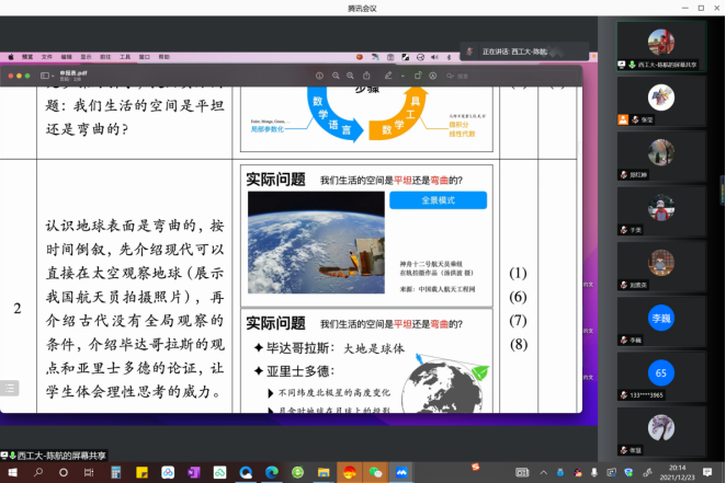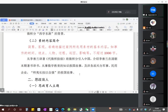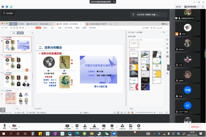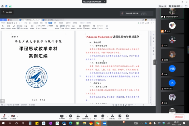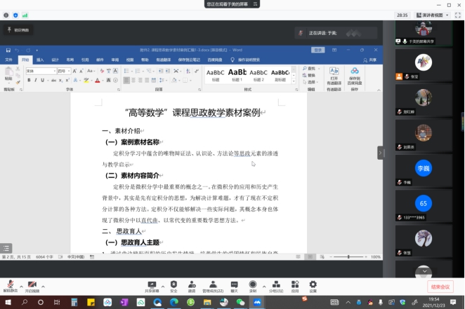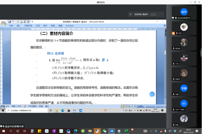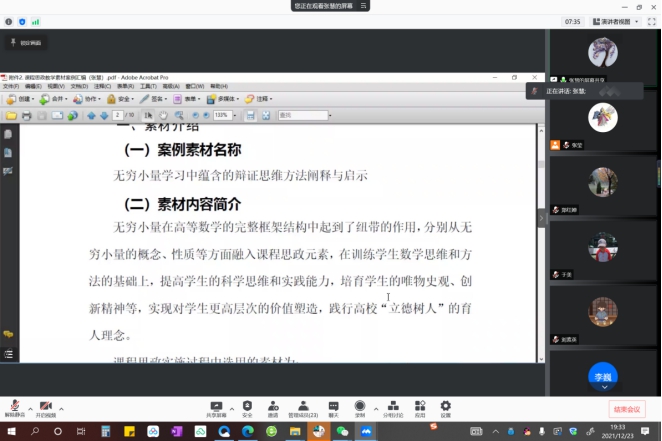 为进一步推进微积分课程的课程思政建设,提高任课教师对课程思政的理解和运用能力,进一步提升公共基础课程的育人实效,12月23号微积分课程教学团队举行了本学年团队的第四次全体会议,暨微积分课程思政素材案例分享交流会。本次会议共有23位教师在线参加,其中8位教师进行了课程思政教学经验和案例分享,会议由课程负责人张莹主持。