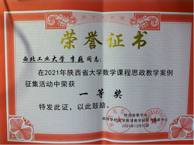 李巍老师将老子道德经中的“大生于小”的事物发展观和刘徽割圆术中的古代数学思想融入到定积分概念的讲授中;并将清朝末期洋务派知识救国的历史,及清代数学家李善兰将微积分引入中国的故事,融入到微积分西学东渐历史的讲授中。该案例在2021年陕西省大学数学课程思政教学案例征集活动中荣获一等奖。