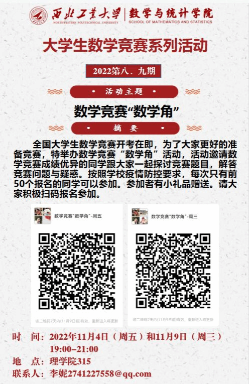 2022年在教务处支持下(院级)大学生数学能力创新实践基地成立,由聂玉峰院长担任基地负责人。金沙娱乐场 将在教务处支持下认真组织校级、省级、国家级大学生数学竞赛,努力打造一流创新实践平台,为我校创新人才培养,特别是工科数学人才培养贡献力量。