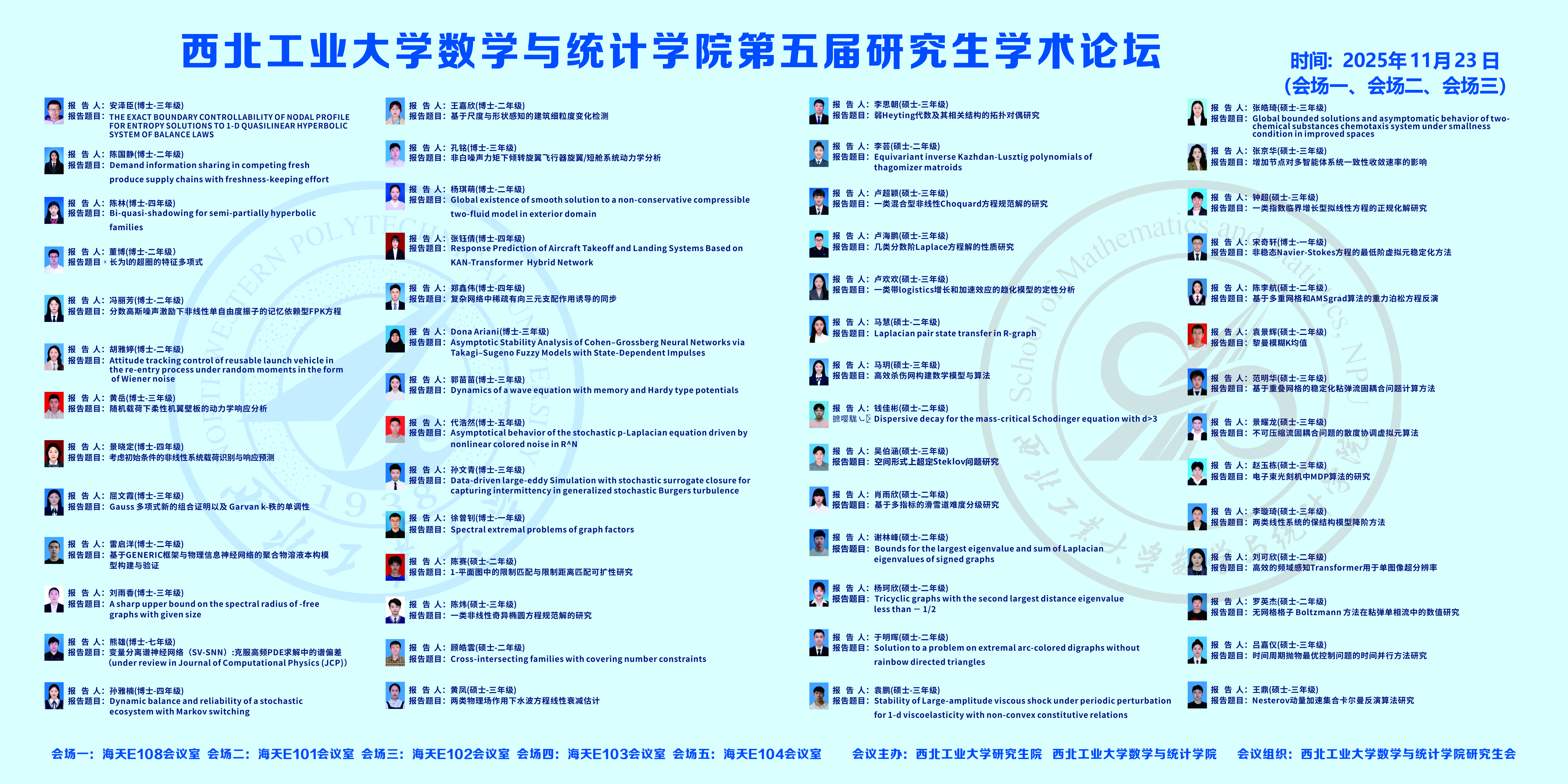 为了进一步落实数学学科“双一流”建设,营造研究生学术创新氛围,展示研究生学术创新成果,提高研究生培养质量,金沙娱乐场 第五届研究生学术论坛将于2025年11月23日在西北工业大学长安校区举办。本次论坛旨在为研究生提供一个高水平的学术交流平台,促进研究生之间的学术交流和思想碰撞,培养创新意识,营造良好的学术氛围,达到开阔视野、启迪智慧,提高创新能力的目的。