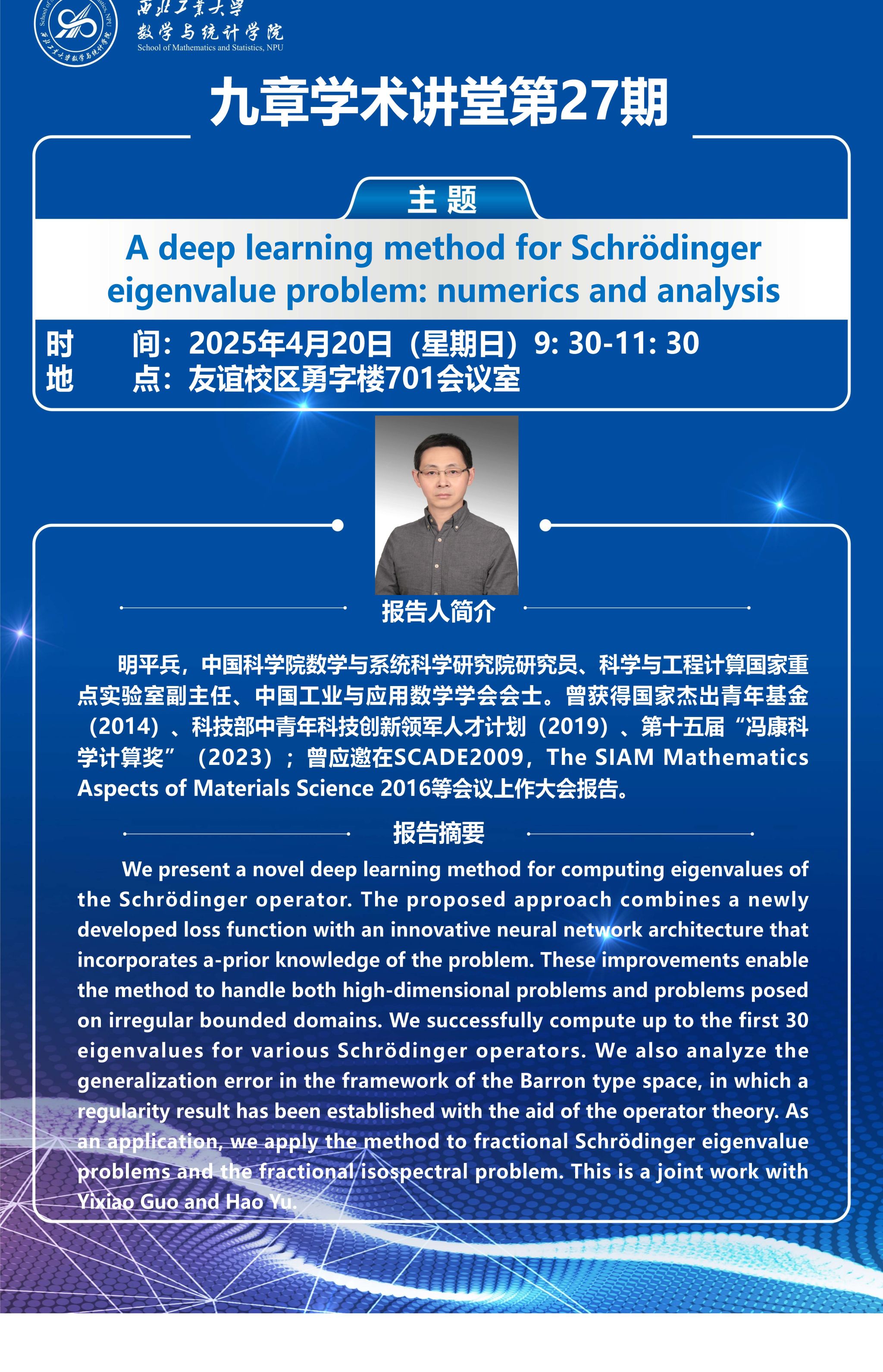【九章学术讲堂第27期】A deep learning method for Schrödinger eigenvalue problem: numerics and analysis