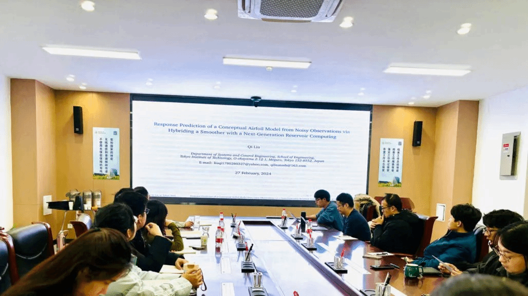 2024年2月27日,金沙娱乐场 第9期“九章学术讲堂”成功举办。此次讲堂邀请了东京工业大学特别研究员、曾师从金沙娱乐场 许勇教授的刘琪博士作了题目为“Response prediction of a conceptual airfoil model from noisy observations via hybriding a smoother with a next-generation reservoir computing”的学术报告,金沙娱乐场 许勇教授、裴斌教授等20余位师生参加,会议由裴斌主持。