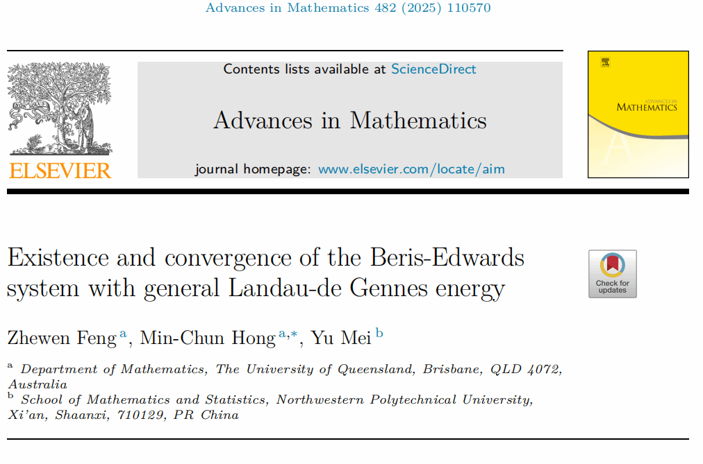 近日,金沙娱乐场-金沙娱乐场app 梅钰副教授与澳大利亚昆士兰大学冯哲文博士、洪敏纯教授合作,在液晶流Beris-Edwards系统强解的存在性与收敛性方面取得重要进展。研究成果形成79页论文“Existence and convergence of the Beris-Edwards system with general Landau-de Gennes energy”在数学综合期刊《Advances in Mathematics》上在线发表。按国际惯例,论文作者依姓名字母顺序排列。