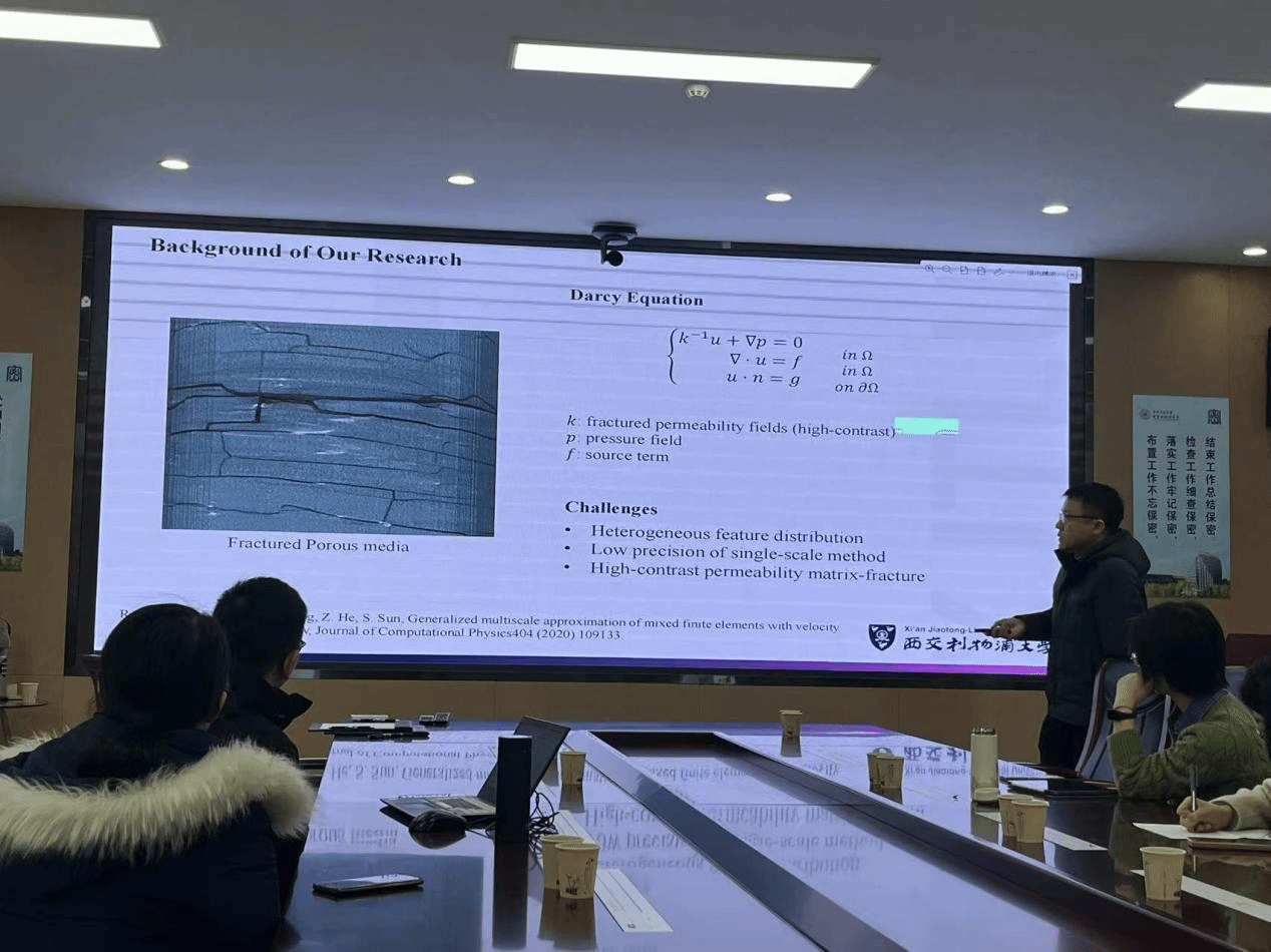 在报告中,陈洁副教授以地下渗流数值模拟问题为切入点,系统阐述了高对比度、非均质渗透率系数下的Darcy方程求解方法,他重点介绍了混合尺度有限元方法。以此为基础,陈洁提出了一种创新的压力多尺度空间基函数构建方法,该方法创新性地采用不同策略处理压力项和速度项的刚度矩阵。特别值得一提的是,陈洁还开创性地将混合多尺度方法与神经网络相结合,开发出优化算法。该算法不仅实现了显著的降维效果和计算速度提升,同时保持了良好的计算精度,为解决复杂渗流问题提供了新的思路。