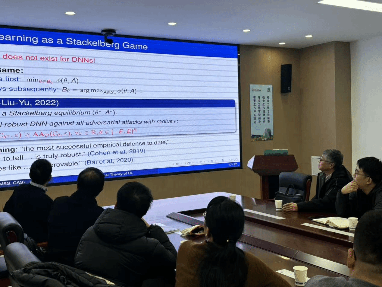 高小山介绍了深度学习泛化与安全数学理论近期的若干进展。随后,高小山从防御者的角度出发,介绍了过参数插值深度网络的泛化性与对抗鲁棒性,并通过Stackelberg博弈给出具有最优对抗鲁邦性的深度网络。同时,他还介绍了如何通过Wasserstein分布鲁邦优化(WDRO)得到同时具有安全性与泛化性的深度网络与大模型。