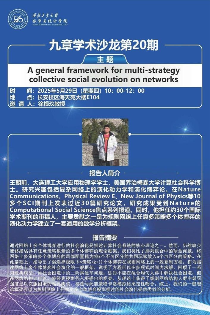 5月29日,美国乔治梅森大学(George Mason University)计算社会科学博士王朝前到访金沙娱乐场 ,为金沙娱乐场 师生带来题为《A general framework for multi-strategy collective social evolution on networks》的学术报告。学院20余位师生参会,会议由副院长徐根玖教授主持。