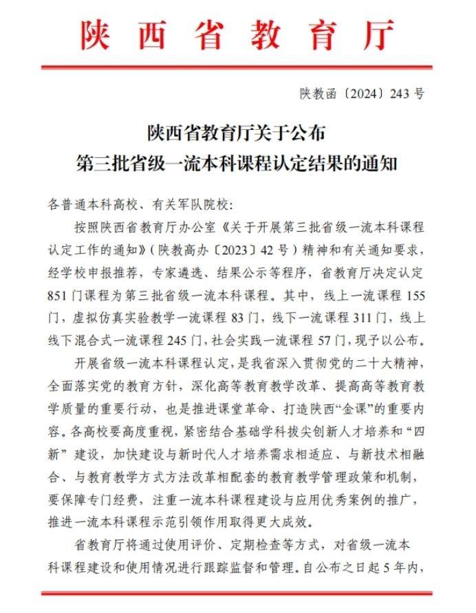 近日,陕西省教育厅公布了第三批省级一流本科课程认定结果,金沙娱乐场 4门课程获批省级一流本科课程。截至目前,学院共获批国家级一流课程6门,省级一流课程12门。
