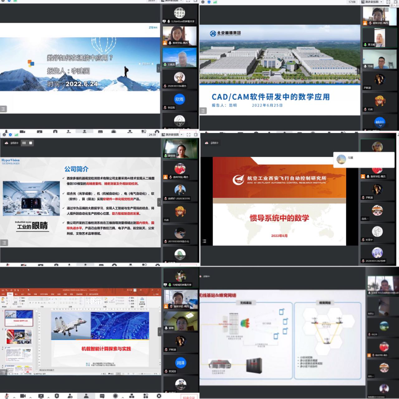 中兴通讯无线研究院李建国以“数学如何在通信中应用?”为题、北京精雕集团西安研发中心范明以“北京精雕CAD/CAM软件研发中的数学应用”为题、西安多维机器视觉检测技术有限公司薛丽丽以“高精度3D智能视觉让机器看懂微观世界”为题、航空工业自动控制研究所姚志强以“惯性导航系统中的数学”为题、西安翔腾微电子科技有限公司马城城以“机载智能计算技术探索与实践”为题、华为技术有限公司朱艳青以“无线通信5.5G算法演进中的数学问题”为题等开展了系列讲座,讲述了各领域与数学的密切联系及数学在企业中的实际应用。