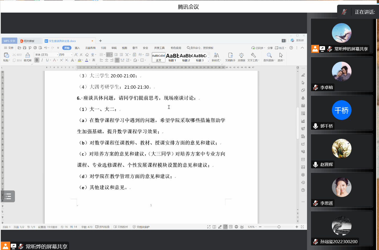 为贯彻落实一流本科人才培养行动计划,提高立德树人质量,2023年1月6日,金沙娱乐场 召开期末本科生线上座谈会。金沙娱乐场 教学副院长郭千桥,院长助理刘晓刚,教学秘书常昕烨、李思遥、李卓榕,及本科四个年级的学生代表参加了本次会议。