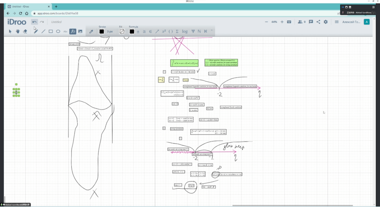 课程初始,Alexey Gorshkov副教授讲述了变分法的历史,变分法来源于古老的最速降线问题。Alexey Gorshkov副教授从有限维极值问题引入,分别回顾了函数的条件极值和非条件极值。定量地描述了一阶和二阶情况下局部极值的充分必要条件。在解决局部极值的同时,带领学生回顾了高等代数中的Sylvester准则,建立起了Euclid空间中导数和Banach空间中导数的联系,通过大量的示例探究了如何求泛函的导函数。