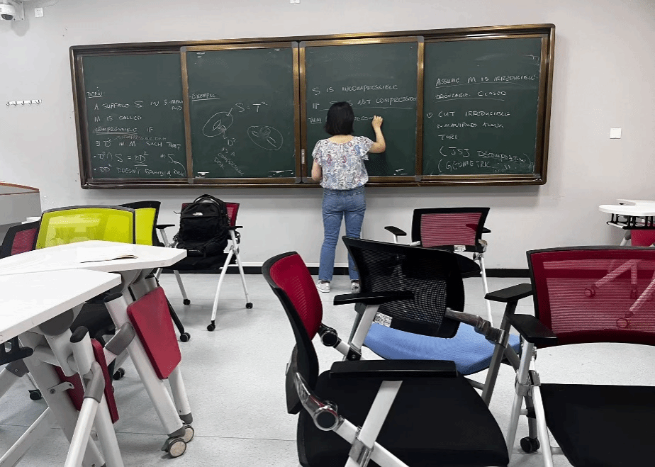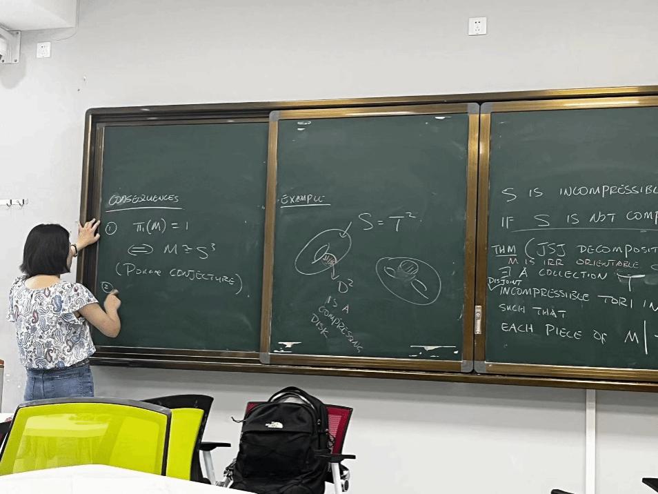 本课程的主题是学习了解几何拓扑和可序群。胡瑛副教授从最基础的点集拓扑出发,第一节课就深入浅出地讲解了van kapan定理以及一点庞加莱猜想,激发了学生们极大的研究兴趣。