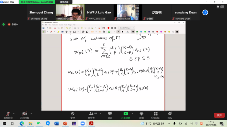 2021年8月9日至8月18日,金沙娱乐场 暑期国际讲堂《极值组合论》通过Zoom圆满完成授课。该课程由西北工业大学顾问教授Gyula O.H. Katona(匈牙利科学院院士、欧洲科学院院士和保加利亚科学院外籍院士)讲授。来自数学、材料科学与工程及本硕实验班等专业的本科生、研究生及旁听生参加了该课程,听课人数超过了200人。