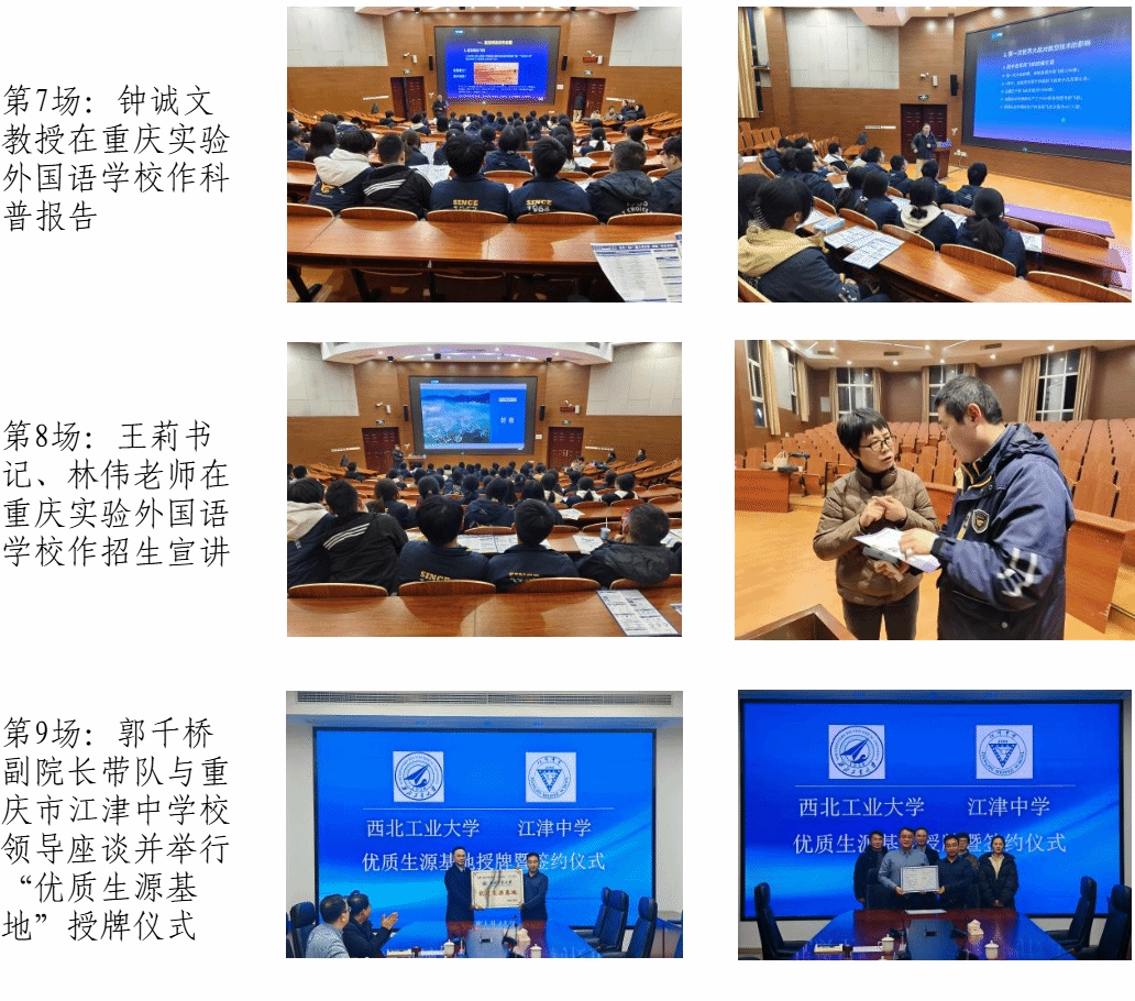 1月21日上午,王莉书记与招生组受邀到重庆市育才中学校开展招生宣传活动,教务主任俞建操出席活动。面向高三学生进行招生宣讲,钟诚文教授做客《行知讲坛》第1期进行科普讲座,现场气氛热烈火爆。下午,王莉书记带领招生组来到重庆实验外国语学校进行“优质生源基地”授牌活动,并赠送J-20模型。重庆实验外国语学校党委书记肖艳、校长钟艳等领导参加了授牌仪式。双方围绕学生研学、中外合作等议题深入探讨。会后,钟诚文教授做科普报告,受到学生喜欢,现场气氛热烈。王莉书记、林伟老师分别进行招生宣讲。