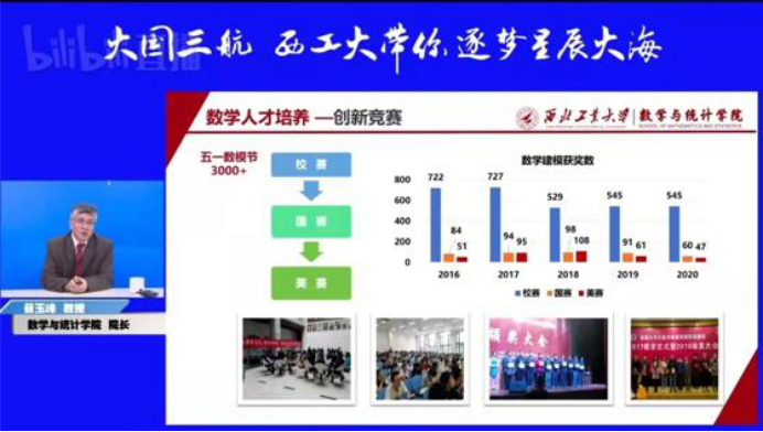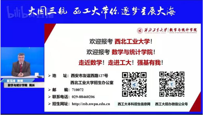 为进一步做好学校招生工作,应学校招生办公室邀请,2022年3月30日20:00,金沙娱乐场 院长聂玉峰教授做客《大国三航 西工大带你逐梦星辰大海》院长直播间,做了题为《走近数学 “强基”工大》的报告。本次报告在招办B站进行了现场直播,共有5000余人通过相关平台在线观看了此次报告。